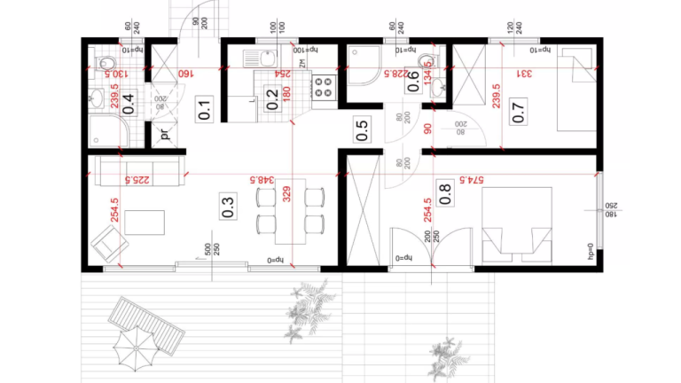 Der Grundriss ist klar in einen Tagesbereich (Bad, offener Wohn- und Essbereich mit Küche) und eine Nachtzone (großes Schlafzimmer mit Terrassenzugang, weiteres Zimmer, Bad) gegliedert.